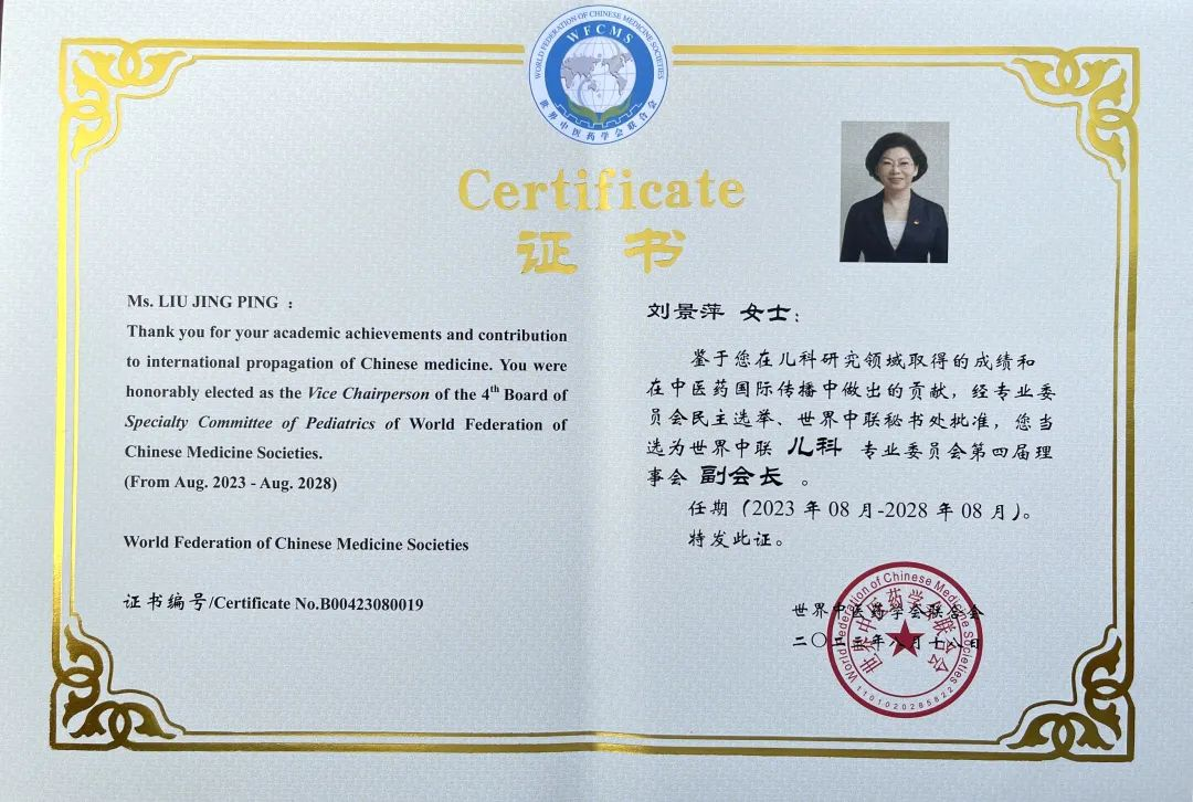 bifa必发药业集团党委书记、董事长刘景萍当选世界中医药学会联合会儿科专业委员会第四届理事会副会长